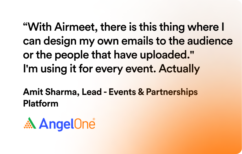 Angel One leveraged Airmeet’s branding capabilities to infuse their brand identity into events by tailoring event landing pages, registration pages, emails, event backdrops, and more. This empowered them to boost brand awareness, lead generation, and enhance their image by integrating their organization’s essence into events and sharing it effectively with attendees.