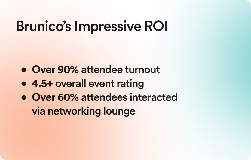 By leveraging Airmeet’s networking, engagement, branding, and customization features, Brunico’s team elevated brand presence, amplified attendee engagement, and improved overall event turnout—with over 90% of registrants attending the event.
