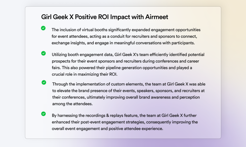 Through strategic utilization of Airmeet’s unique features, Girl Geek X effectively curated an impactful event, empowering their initiatives and fostering meaningful connections within their community.