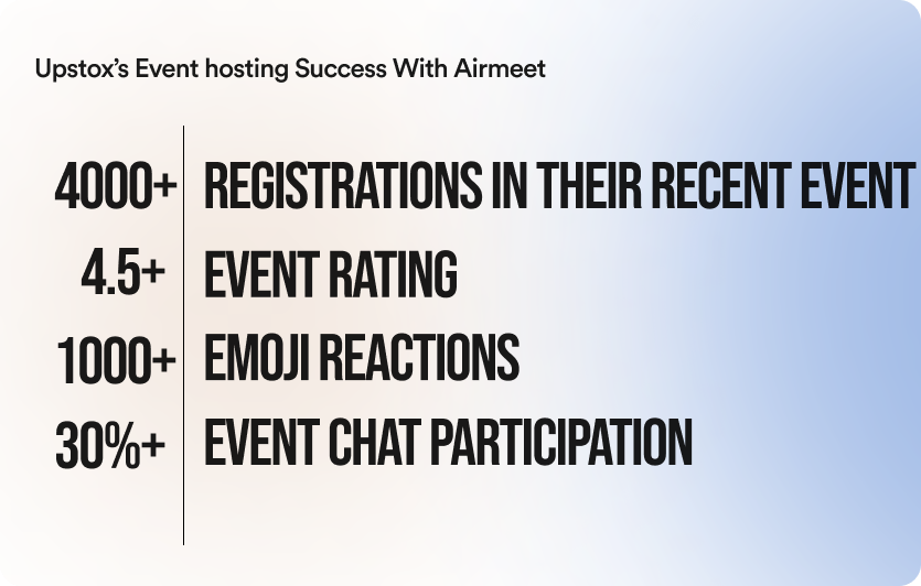 By utilizing Airmeet, Upstox was able to address their concerns successfully. They now benefit from a rich array of features, enjoying multi-dimensional advantages.